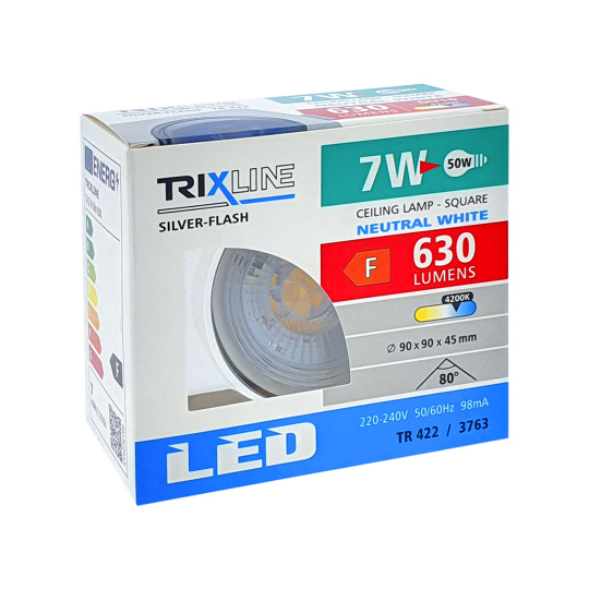 In modern interiors, so-called built-in lights. Recessed spot light TR 422 - square 7W 630lm has neutral white light 4200K pleasant to the eyes, you can choose it for all interior spaces - kitchen, dining room, living room, bedroom, hall, corridor, office. It has quick and easy installation . The surface of the spot light is shiny and silver.