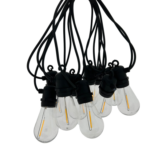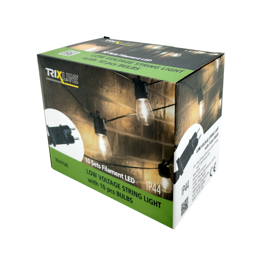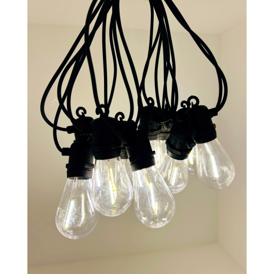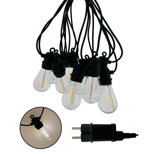 This string of lights contains 10 stylish filament bulbs in warm white color (2700K) on a total length of 8 meters.Robust plastic design with IP44 protection ensures weather resistance, making it ideal for outdoor use. The light chain is powered from the mains (220–240 V) and has a safe output of 31V DC / 3.6W. Thanks to the 3.5-meter power cable, installation is easy and flexible.