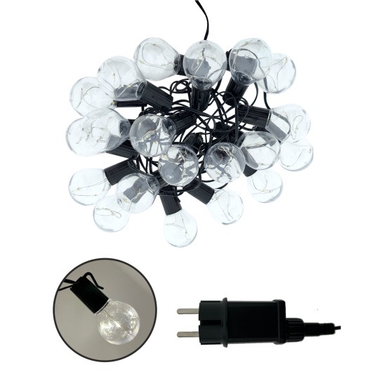 This string of lights contains 20 stylish bulbs, each housing 3 warm white LEDs (2700K) – a total of 60 LEDs over a total length of 5.8 meters.Robust plastic design with IP44 protection ensures weather resistance, making it ideal for outdoor use. The light chain is powered from the mains (220–240 V) and has a safe output of 4.5 V DC / 1.5 W. Thanks to the 2-meter power cable, installation is easy and flexible.