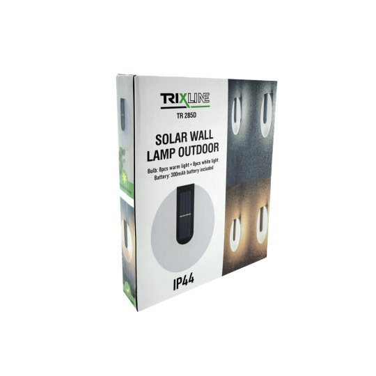 Stylish and economical solution for lighting your garden, terrace, or balcony. LED Solar Wall Light TR-285D can be easily mounted on the wall using the included mounting material, and you can choose between 8 warm color LED lights (2700K) or 8 cool color LED lights (6400K). Thanks to solar power, it is ideal for outdoor use without the need to connect to the electrical grid.