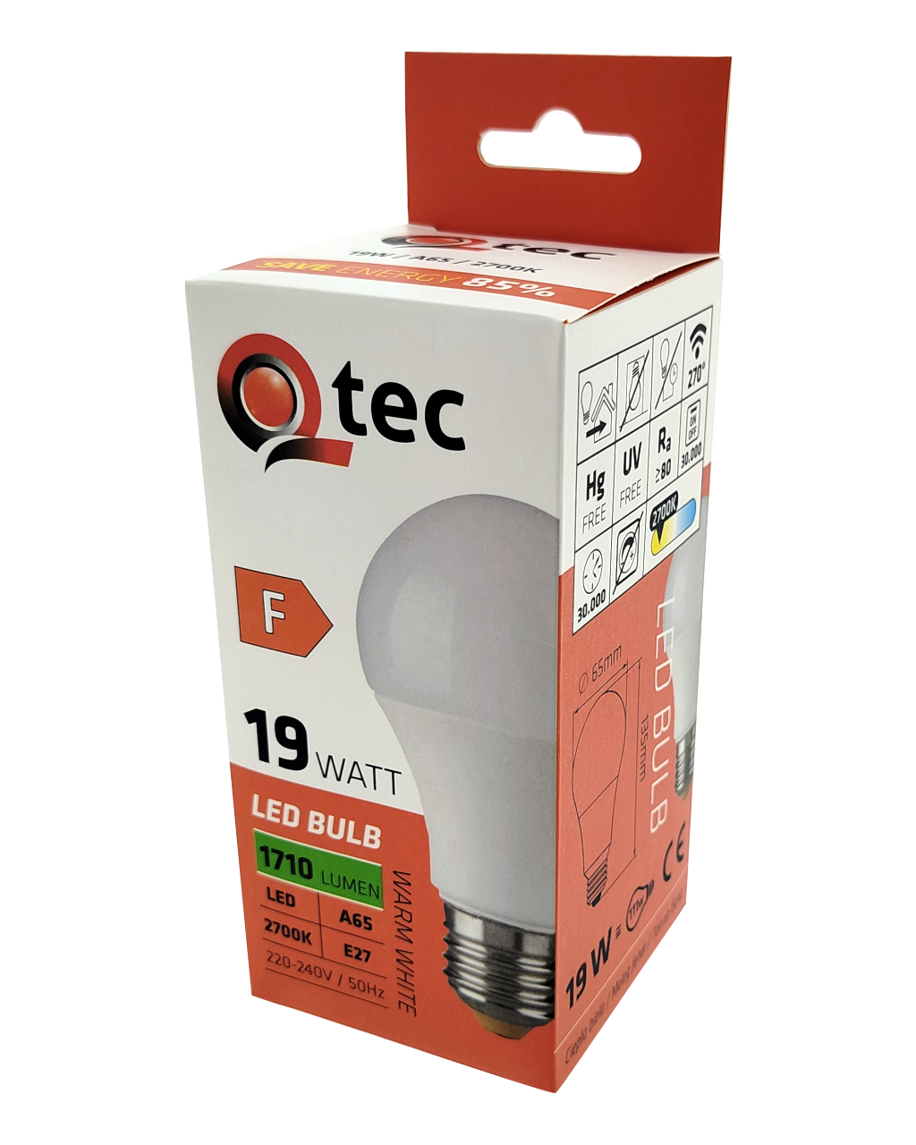 LED BULB Q-tec is an energy-saving LED bulb with an E27 base, environmentally friendly as it contains no mercury or lead, and it also performs well in extremely low and high temperatures, where filament bulbs often have issues. Its lifespan reaches up to 30,000 hours. The LED bulb lights up immediately after being turned on without any delay and emits a pleasant warm white light 2700K.