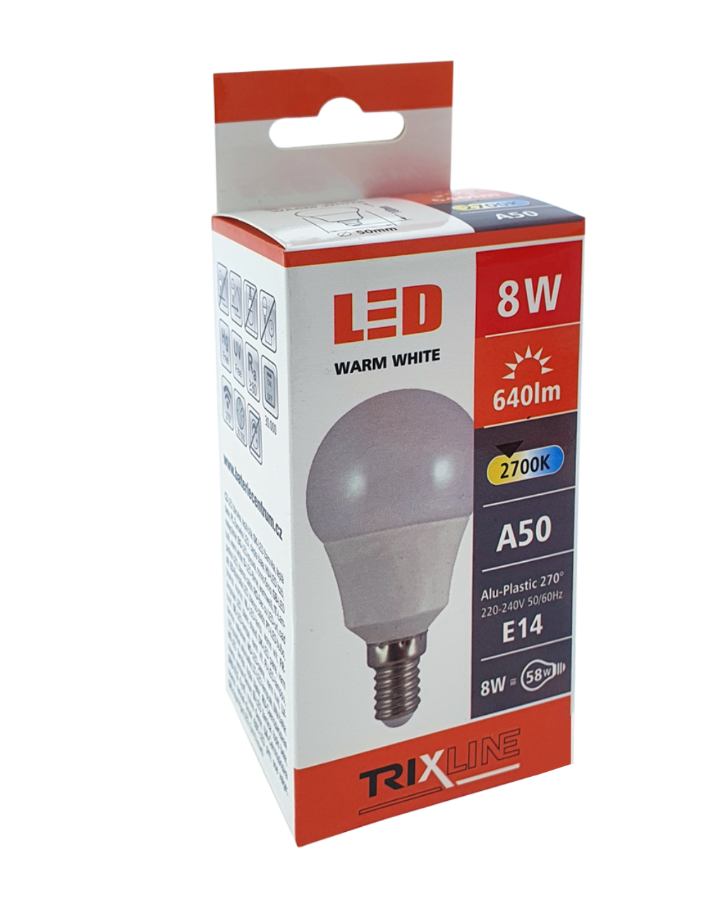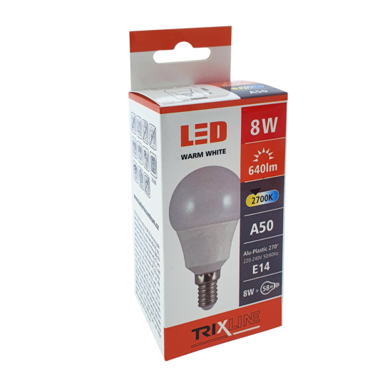 LED BULB TRIXLINE is an economical LED bulb with an E14 base, environmentally friendly, because it does not contain any mercury or lead, and it also proves itself well even at extremely low and high temperatures, where there are problems with filament bulbs.Its lifespan reaches up to 30,000 hours.Thanks to its 8W output, it will serve perfectly as a replacement for a classic 58W light bulb. The LED bulb lights up immediately after switching on without any delay and emits a pleasant warm white light of 2700K.
