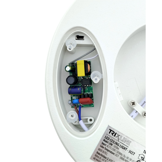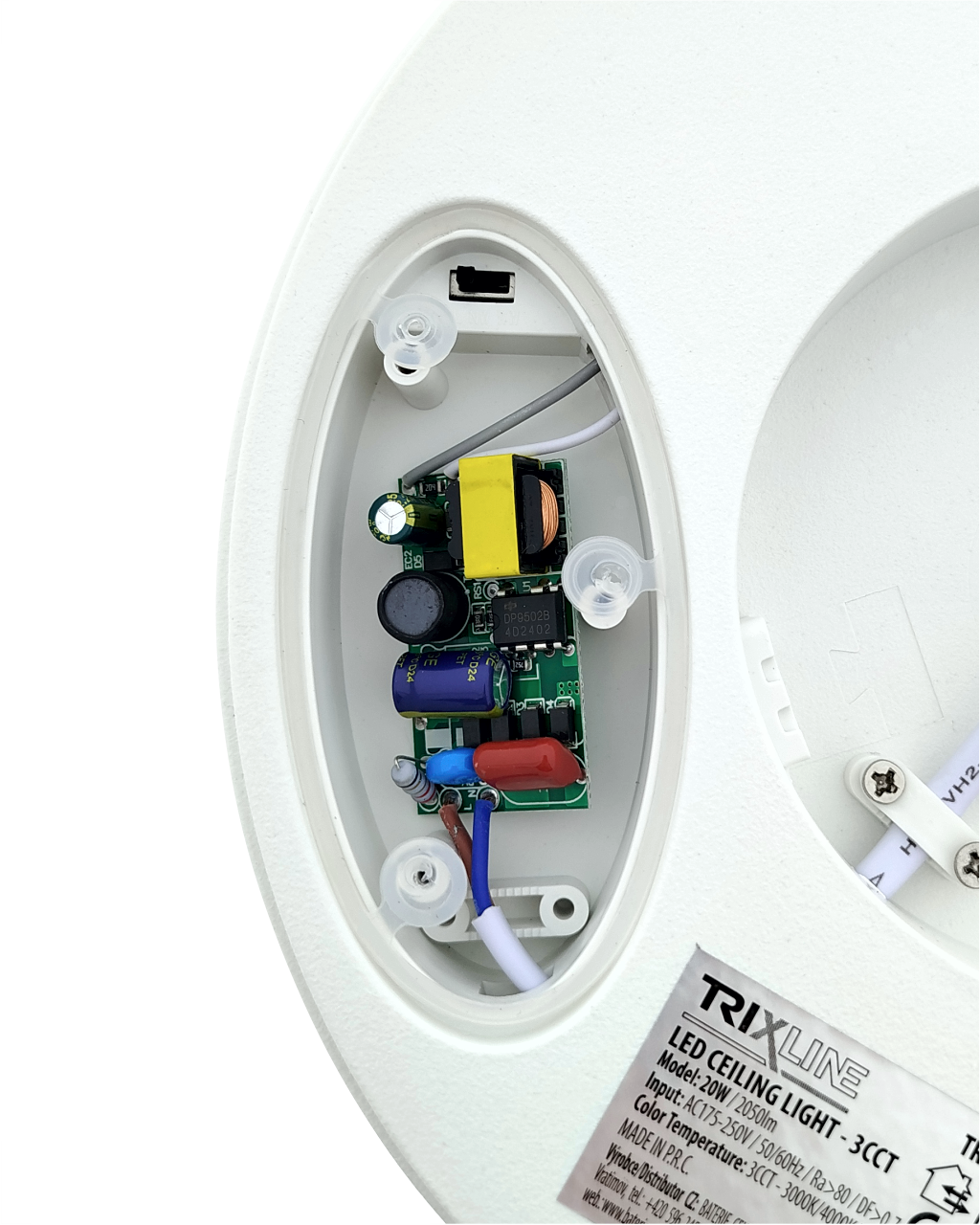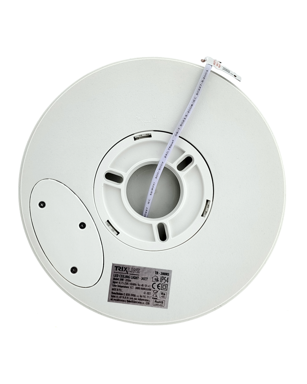 Modern and powerful LED CCT ceiling light TR-200NS Trixline - provides high-quality and even lighting with a strength of 2050 lumens.Adjustable CCT allows the selection of warm, neutral, or cool white light (3000K/4000K/6500K) for optimal adaptation of the room's atmosphere. The light temperature is adjusted under the cover on the back using a slider. Pleasant and efficient lighting that meets your aesthetic and practical requirements. The light fixture can be installed in various locations due to its universal features and IP54 rating, which ensures protection against dust and splashing water.