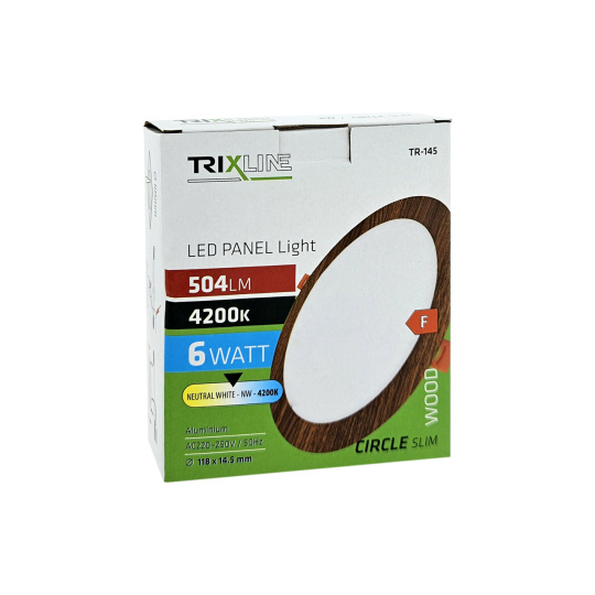 Circular built-in LED panel Trixline T-145 with a power of 6W with a luminous flux of 504lm and a neutral white light color of 4200K.Impressive design in wood decor. The panel is made of high-quality aluminum.Thanks to the LED technology used , you can save up to 85% of energy.It is intended for interior use to be embedded in plasterboard with a mounting hole of 10.3 cm in diameter.The outer dimension of the light is ø11.8x1.45cm.Quick and easy installation.