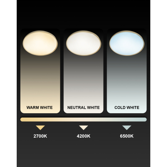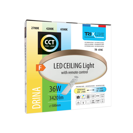 LED ceiling lamp TR-616C - DRINA Trixline in gold color is intended for indoor spaces such as living rooms, bedrooms, halls, offices, corridors and similar places. Using the included controller, you can switch between three light temperatures ranging from 2700K to 6500K , which can be dimmed as needed to create a pleasant atmosphere. At maximum dimming, consumption drops to just 6W from the original 36W, which guarantees energy savings.Another option on the remote control is the night mode and the 30-second function, after which the LED light turns itself off. After switching off, the lamp remembers the last set mode , which ensures convenient and intuitive use.