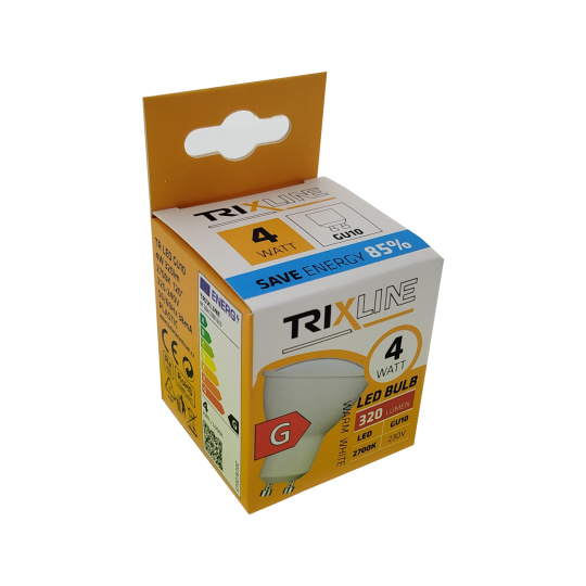 Energy-saving LED bulb Trixline with GU10 base, environmentally friendly, contains no mercury or lead, and performs well even in extremely low and high temperatures, where filament bulbs often have issues.Its lifespan reaches up to 30,000 hours.Thanks to its 4W performance, it serves excellently as a replacement for a traditional 34W bulb. The LED bulb lights up immediately after being turned on without any delay and emits a pleasant warm white light 2700K.