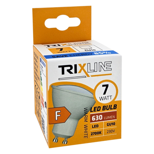 The energy-saving Trixline LED bulb with a GU10 socket, environmentally friendly, contains no mercury or lead, and also performs well even at extremely low and high temperatures.Its lifespan reaches up to 30,000 hours.Thanks to its 7W output, it will serve perfectly as a replacement for a classic 63W light bulb. The LED bulb lights up immediately after switching on without any delay and emits a pleasant warm white light of 2700K.