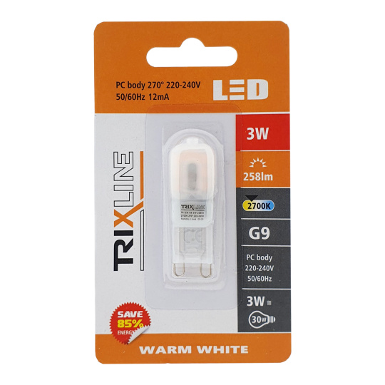 High-quality spot LED bulb with a G9 socket with a power of 3W (replacement for a classic 30W bulb). Provides warm white light. The modern technology and materials used guarantee a long service life of up to 30.000 hours.When switched on, the full light output of the bulb is immediately available without heating it up.