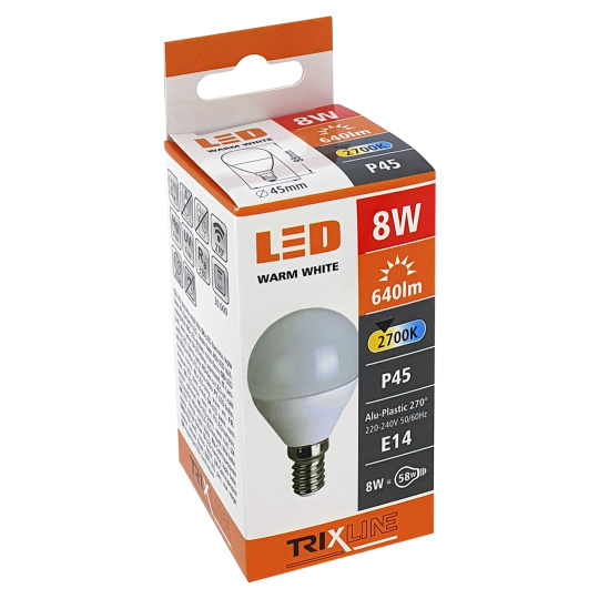 LED BULB TRIXLINE is an economical LED bulb with an E14 base, environmentally friendly, because it does not contain any mercury or lead, and it also proves itself well even at extremely low and high temperatures, when there are problems with filament bulbs.Its lifespan reaches up to 30,000 hours.Thanks to its 8W output, it will serve perfectly as a replacement for a classic 58W light bulb. The LED bulb lights up immediately after switching on without any delay and emits a pleasant warm white light of 2700K.