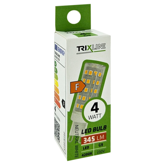 High-quality Trixline LED spot bulb with G9 socket with 4W output (replacement for a classic 25W bulb).Provides cool white light. The modern technology and materials used guarantee a long service life of up to 30.000 hours.When switched on, the full light output of the bulb is immediately available without heating it up.
