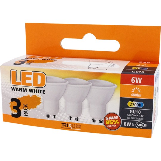 TRIXLINE POINT LED BULBS in a convenient package of 3 pieces. The energy-saving LED bulb with a GU10 socket is environmentally friendly, it does not contain any mercury or lead. Unlike filament bulbs , it also handles extremely low and high temperatures . Its lifespan reaches up to 30,000 hours.Thanks to its 6W output, it will serve perfectly as a replacement for a classic 50W light bulb. The LED bulb lights up immediately after switching on without any delay and emits a pleasant warm white light of 2700K. You can use the bulb in the bedroom or children's room, the color of the light is ideal for relaxation.