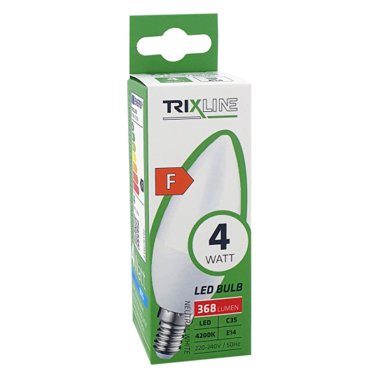 LED energy-saving lamp TRIXLINE (you save 85% energy) with an E14 socket, environmentally friendly, contains no mercury or lead, moreover, it proves itself well even at extremely low and high temperatures, when there are problems with filament bulbs.Its lifespan reaches up to 30,000 hours.Thanks to its 4W output, it will serve perfectly as a replacement for a classic 37W light bulb. The LED bulb lights up immediately after switching on without any delay and emits a pleasant neutral white light of 4200K.