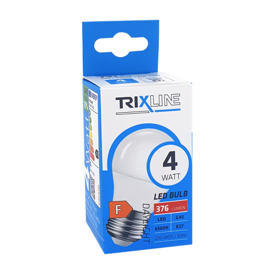 LED energy-saving lamp TRIXLINE (you save 85% energy) with an E27 base, environmentally friendly, contains no mercury or lead, moreover, it proves itself well even at extremely low and high temperatures, when there are problems with filament bulbs.Its lifespan reaches up to 30,000 hours.Thanks to its 4W output, it will serve perfectly as a replacement for a classic 37W light bulb. The LED bulb lights up immediately after switching on without any delay and emits a pleasant cold white light of 6500K.