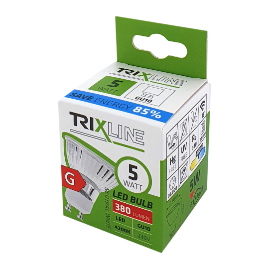 LED SPOT BULB TRIXLINE is an economical LED bulb with a GU10 base, environmentally friendly, because it does not contain any mercury or lead, and it also proves itself well even at extremely low and high temperatures, when there are problems with filament bulbs.Its lifespan reaches up to 30,000 hours.Thanks to its 5W output, it will serve perfectly as a replacement for a classic 42W light bulb. The LED bulb lights up immediately after switching on without any delay and emits a pleasant neutral white light of 4200K.