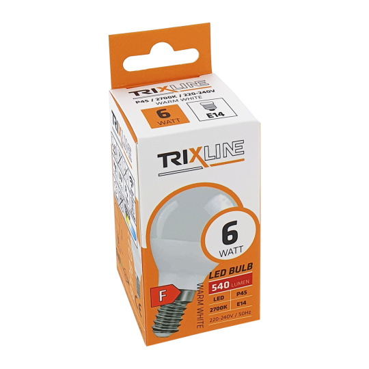 LED BULB TRIXLINE is an economical LED bulb with an E14 base, environmentally friendly, because it does not contain any mercury or lead, and it also proves itself well even at extremely low and high temperatures, where there are problems with filament bulbs.Its lifespan reaches up to 30,000 hours.Thanks to its 6 W output, it will serve perfectly as a replacement for a classic 50 W light bulb. The LED bulb lights up immediately after switching on without any delay and emits a pleasant warm white light of 2700K.