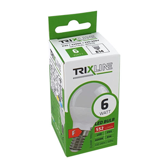 LED BULB TRIXLINE is an economical LED bulb with an E14 base, environmentally friendly, because it does not contain any mercury or lead, and it also proves itself well even at extremely low and high temperatures, where there are problems with filament bulbs.Its lifespan reaches up to 30,000 hours.Thanks to its 6W output, it will serve perfectly as a replacement for a classic 52W light bulb. The LED bulb lights up immediately after switching on without any delay and emits a neutral white light of 4200K.