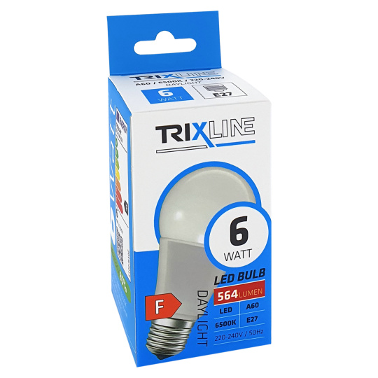 LED BULB TRIXLINE is an economical LED bulb with an E27 base, environmentally friendly, because it does not contain any mercury or lead, moreover, it proves itself well even at extremely low and high temperatures, when there are problems with filament bulbs. Its lifespan reaches up to 30,000 hours. Thanks to its 6W output, it will serve perfectly as a replacement for a classic 54W light bulb. The LED bulb lights up immediately after switching on without any delay and emits a pleasant cold white light of 6500K.