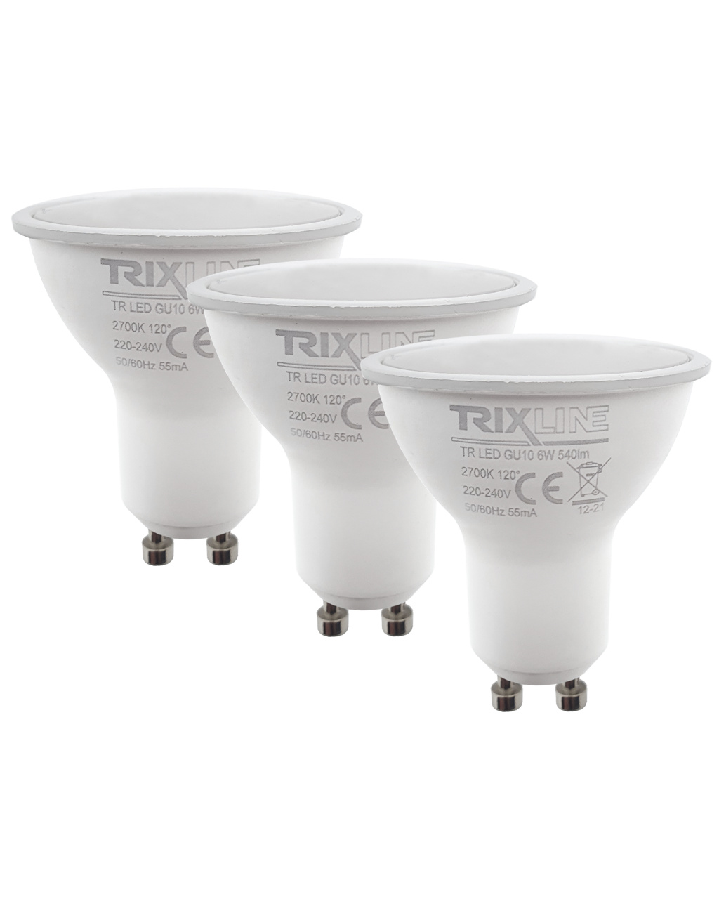 TRIXLINE POINT LED BULBS in a convenient package of 3 pieces. The energy-saving LED bulb with a GU10 socket is environmentally friendly, it does not contain any mercury or lead. Unlike filament bulbs, it also works well at extremely low and high temperatures .Its lifespan reaches up to 30,000 hours.Thanks to its 6W output, it will serve perfectly as a replacement for a classic 50W light bulb. The LED bulb lights up immediately after switching on without any delay and emits a pleasant warm white light of 2700K.You can use the light bulb in the bedroom, living room, etc.
