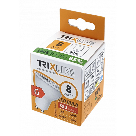 LED SPOT BULB TRIXLINE is an economical LED bulb with a GU10 base, environmentally friendly, because it does not contain any mercury or lead, and it also proves itself well even at extremely low and high temperatures, when there are problems with filament bulbs.Its lifespan reaches up to 30,000 hours.Thanks to its 8W output, it will serve perfectly as a replacement for a classic 58W light bulb. The LED bulb lights up immediately after switching on without any delay and emits a pleasant warm white light of 2700K.