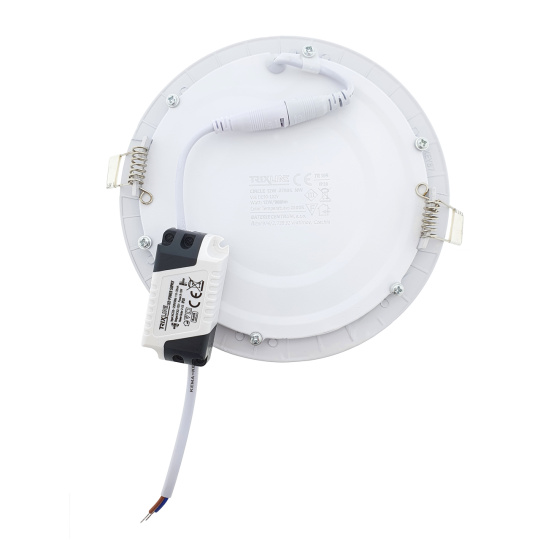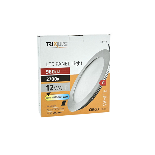 Circular built-in LED panel Trixline TR-144 with a power of 12W with a luminous flux of 960lm and a warm white light color of 2700K. The warm white color of the light cosifies the space, creates a feeling of well-being and warmth. It is suitable for a room where we want to relax and rest. The panel is made of high-quality aluminum. Thanks to the LED technology used, you can save up to 85% of energy. It is intended for interior use to be embedded in plasterboard with a mounting hole of ø15.2cm. The outer dimension of the light is ø16.7x1.45cm.