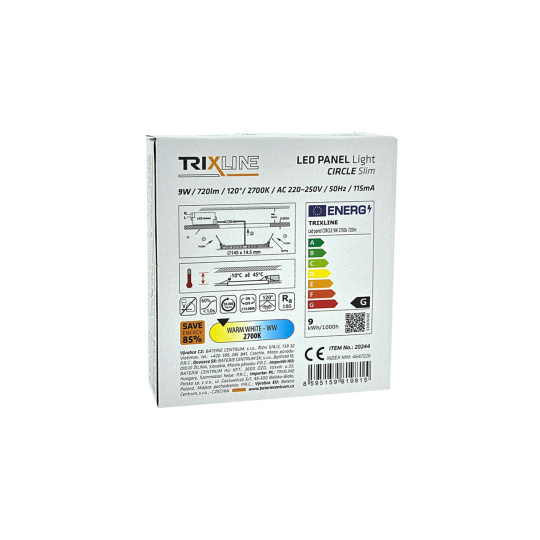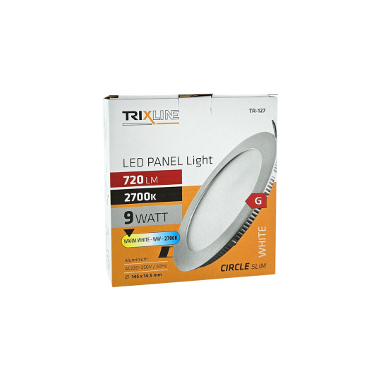 Circular built-in LED panel Trixline TR-127 with a power of 9W with a luminous flux of 720lm and a warm white light color of 2700K. The warm white color of the light cosifies the space, evoking a feeling of well-being and warmth. It is suitable for a room where we want to relax and rest. The panel is made of high-quality aluminum. Thanks to the LED technology used, you can save up to 85% of energy. It is intended for interior use to be embedded in plasterboard with a ø13cm mounting hole. The outer dimension of the light is ø14.5x1.45cm.