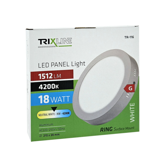 Trixline TR-116 ring mounted LED panel with a power of 18W with a luminous flux of 1512lm and a neutral white light color of 4200K. The neutral white color of light is suitable for rooms where we need to do work, concentrate and be active. The panel is made of high-quality aluminum. Thanks to the LED technology used, you can save up to 85% of energy. It is intended for interior use. The outer dimension of the light is 21x21x2.8cm. Quick and easy installation.