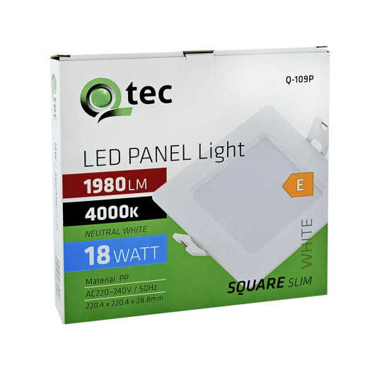 Square recessed LED panel Qtec Q-109P with a power of 18W and a luminous flux of 1980lm in neutral white light color 4000K.