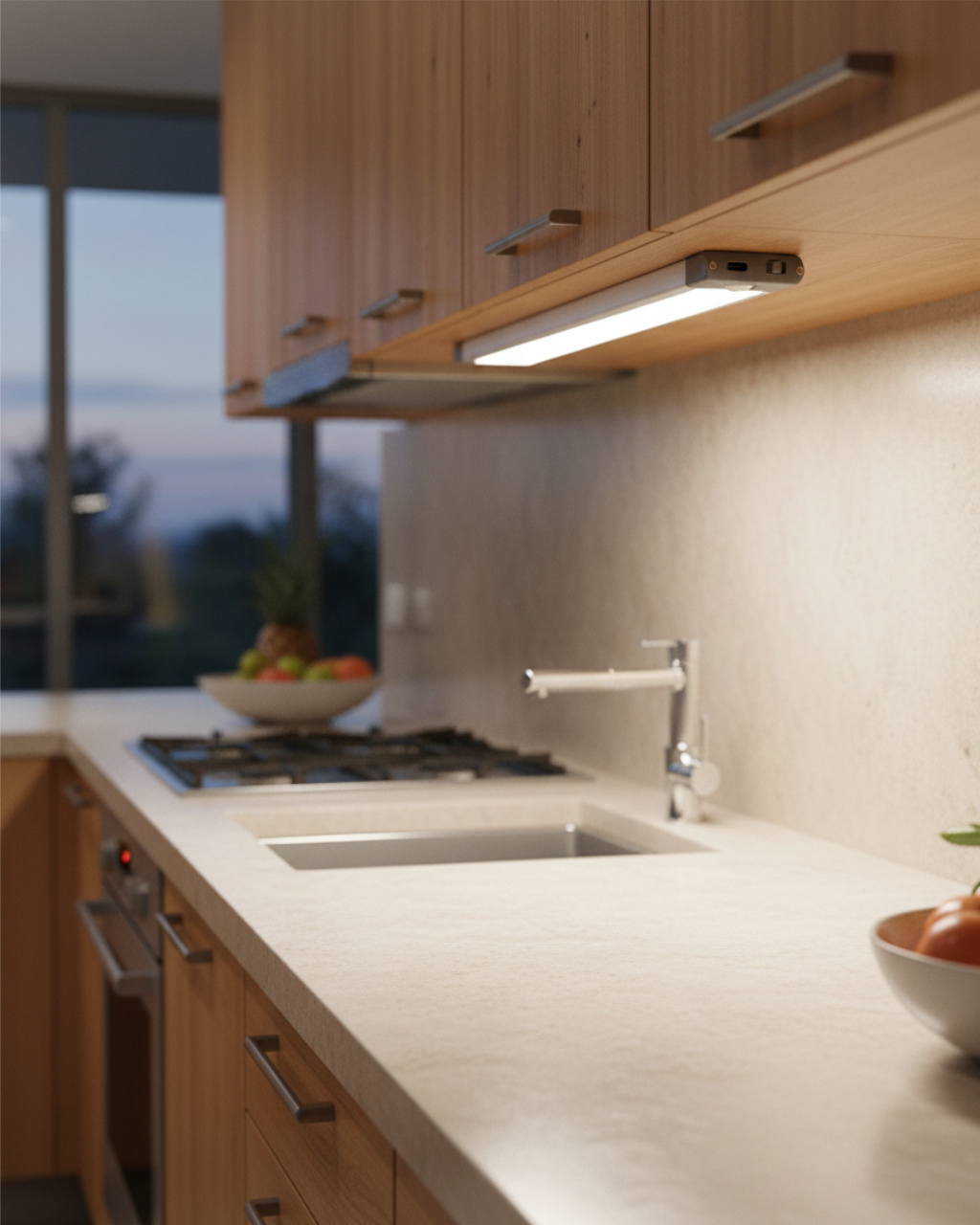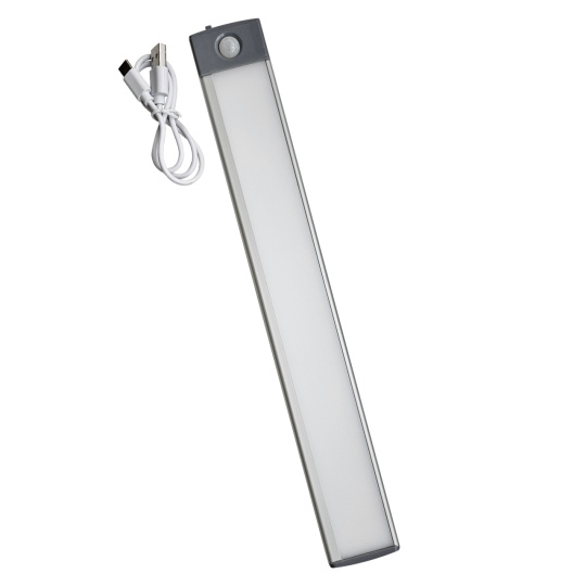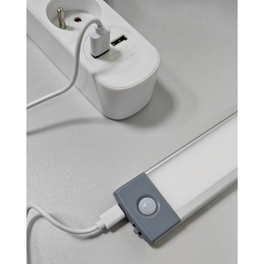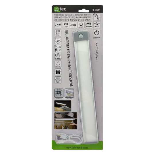 The practical and energy-saving charging LED light with motion sensor Q-325W by QTEC is an ideal choice for lighting cabinets, corridors, stairs, kitchen counters, bed frames, shelves, or other spaces where you need efficient and automatic lighting. Thanks to the integrated 800mAh rechargeable battery, it is easy to install without the need for connection to the electrical grid. You can charge the light with a USB-C cable, which is included in the package. Intelligent motion sensor with a detection range of 3m and a viewing angle of 120° automatically activates the light for 20s upon detecting movement. The light fixture offers 3 modes – OFF, AUTO, and ON – allowing either continuous lighting or automatic activation as needed. Installation is simple with magnetic mounting, which allows for easy attachment without the need for drilling. The elegant design combining aluminum and plastic in silver color will perfectly fit into any interior. In addition, the high quality of color rendering (CRI ≥ 80) ensures clear and natural lighting.