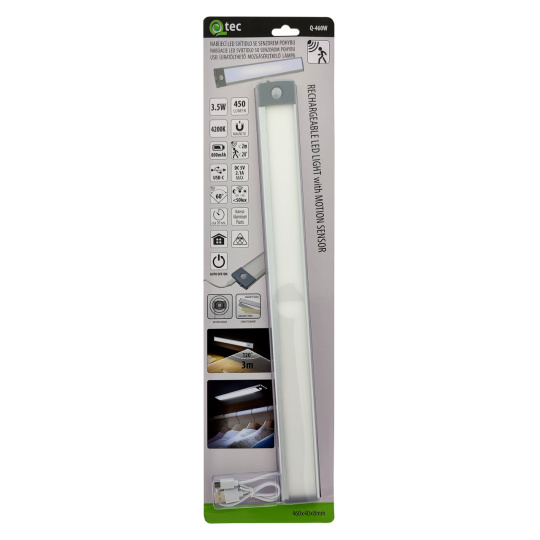 The practical and energy-saving charging LED light with motion sensor Q-460W by QTEC is suitable for lighting cabinets, corridors, staircases, kitchen counters, bed frames, shelves, or other spaces where you need efficient and automatic lighting. Thanks to the integrated 800mAh rechargeable battery, it is easy to install without the need for connection to the electrical grid. You can charge the light with a USB-C cable, which is included in the package. Motion sensor with a detection distance of 3m and a viewing angle of 120° automatically activates the light for 20s upon detecting movement. The light fixture offers 3 modes – OFF, AUTO, and ON – allowing either continuous lighting or automatic activation as needed. Installation is simple with magnetic mounting, which allows for easy attachment without the need for drilling. The elegant design combining aluminum and plastic in silver color will perfectly fit into any interior. In addition, the high quality of color rendering (CRI ≥ 80) ensures clear and natural lighting.