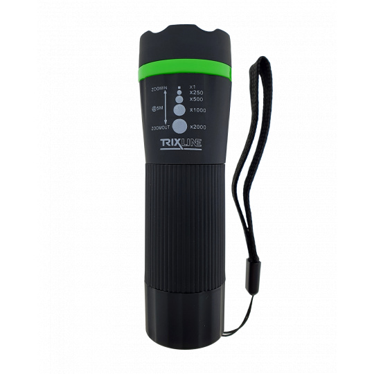 Handheld LED flashlight with zoom . It stands out above all for its high luminosity, adjustable width of light cone and afterglow of up to 5 m. Lighting mode ON/OFF, zoom x1/x250/x500/x1000/x2000.