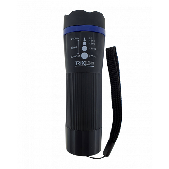 Handheld LED flashlight with zoom . It stands out above all for its high luminosity, adjustable width of light cone and afterglow of up to 5 m. Lighting mode ON/OFF, zoom x1/x250/x500/x1000/x2000.