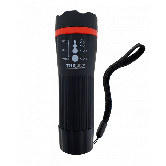 Handheld LED flashlight with zoom . It stands out above all for its high luminosity, adjustable width of light cone and afterglow of up to 5 m. Lighting mode ON/OFF, zoom x1/x250/x500/x1000/x2000.