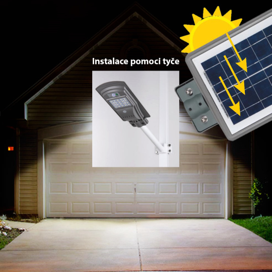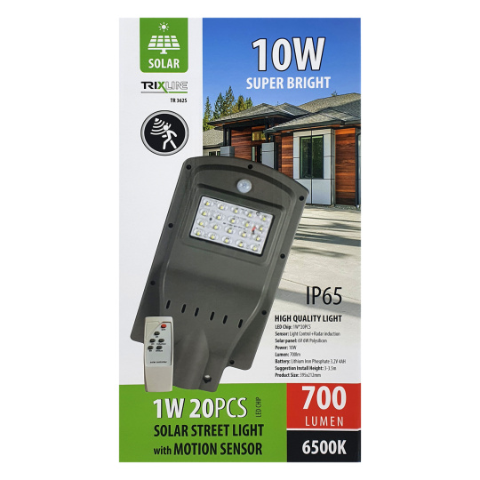 Solar street lamp TR 362S Trixline 10W with motion sensor for remote control. The solar panel is part of the back of the light. The advantage is IP65 protection, which guarantees protection against water jets from all angles and resistance to dust ingress. Suitable for lighting the garden, the sidewalk of a family house or driveways. It is important that the solar panel is exposed to direct sunlight throughout the day, avoid pointing the panels towards buildings, trees and other obstacles.