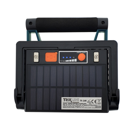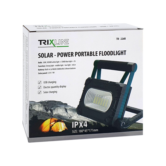 Powerful 30W TR-226R Trixline spotlight on solar energy with power bank function, can also be charged via Micro-USB cable (included in the package). IPX4 splash-proof.