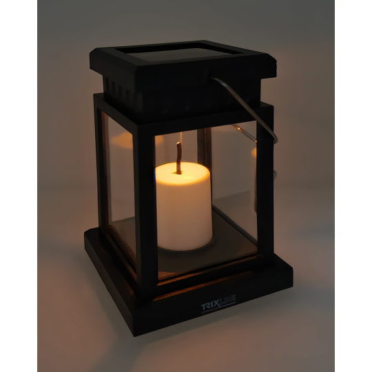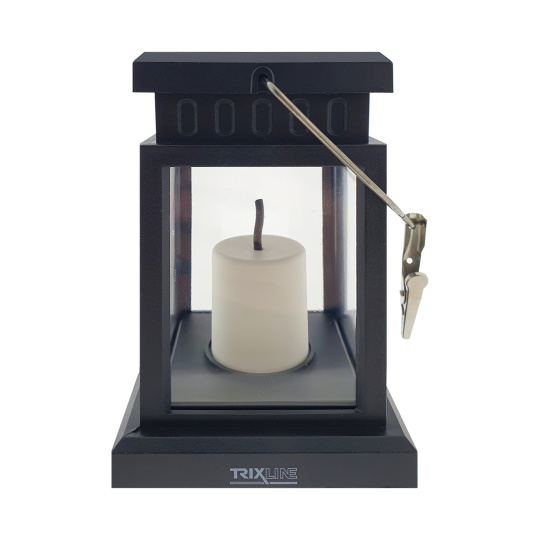 Solar outdoor, garden lantern TR 383S Trixline with a white candle and an LED bulb imitating the classic flickering flame of a candle.Thanks to its IP44 resistance against splashing water, the lantern offers a wide range of uses. Suitable as a garden decoration for lighting a terrace, balcony, pergola, staircase, sidewalk, also for camping, camping, picnics, barbecues and other outdoor activities. The lantern can be placed freely or hung with a metal peg.Ease of use - no tools or wiring required. Just use the optional ON/OFF switch on the inside of the lid with the solar panel to turn it on automatically at dusk.