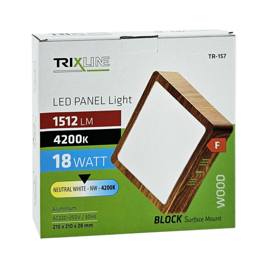 Trixline TR-157 square-mounted LED panel with 18W output, luminous flux 1512lm and neutral white light color 4200K.Impressive design in wood decor. The panel is made of high-quality aluminum.Thanks to the LED technology used , you can save up to 85% of energy.It is intended for interior use.The outer dimension of the light is 21x21x2.8cm.Quick and easy installation.