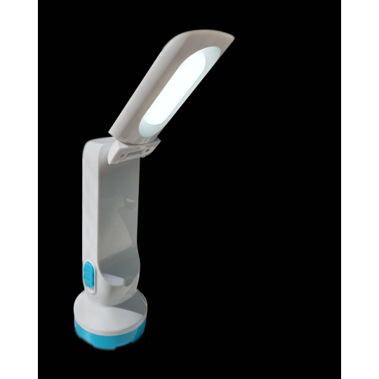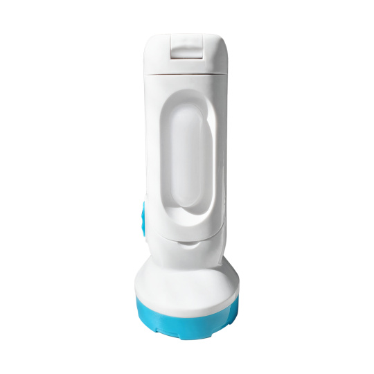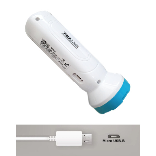The advantage of the TR 002L LED flashlight is USB charging and the option of front and side lighting.The side lighting can be used as an emergency and table lamp. A switch located on the body of the lamp is used to switch on and select front and side lighting modes. Before first use, fully charge the flashlight with the Micro USB B cable (included in the package). Charge the flashlight even if it is not used regularly (once every 3 months, this will extend the life of the battery). The lamp is white in color with a turquoise blue border.