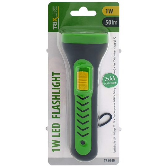 Practical, light LED hand torch TR-073M Trixline with string for hanging. It is powered by 2xAA (R6) pencil batteries (not included in the package). To turn it on, use the yellow switch located on the body of the lamp. The price shown is for 1 pc of lamp. We offer 4 color options - black lamp with blue TR 073M, green TR 074M , yellow TR 075M or red TR 076M edge.