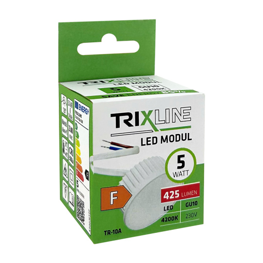 TR-10A LED module TRIXLINE represents a replacement for light sources with a GU10 threaded base. Thanks to its low-profile design, it is an excellent solution for installations with limited space. With a height of 25mm, it can be placed even in the lowest surface-mounted lights. Suitable for recessed lighting where there is not enough space between the ceiling and the roof for a standard GU10 source.The module connects directly to the electrical installation using a cable that includes a WAGO connector for easy and safe connection.