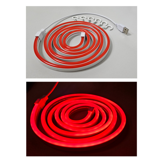 Flexible neon, decorative, red LED strip TR-30N Trixline powered via USB. The strip can be easily bent into any shape, figure or inscription and cut to the desired length every 2.5 cm between the black wires.
