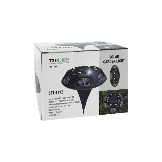 Set of 4 solar garden lights TR-592 Trixline - suitable for lighting a garden, lawn, sidewalk of a family house, for lighting an outdoor staircase, etc. The advantage is resistance against the ingress of small foreign bodies (dust) with a diameter >1 mm, jet water with degree of protection IP44 . You can choose whether you want to place the light freely or fix it in the ground with a peg base (included in the package). Place the button on the back to the ON position before first use. After charging, the light will automatically turn on at night and turn off during the day. It is important that the solar panel is exposed to direct sunlight throughout the day, avoid pointing the panel towards buildings, trees or other obstacles.